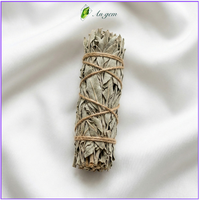 White Sage được thu hoạch và bó thủ công tại Nam California. Khi đốt, lá tỏa khói trắng thơm đặc trưng, giúp thanh lọc năng lượng tiêu cực, làm dịu không gian và hỗ trợ quá trình thiền định, trải bài Tarot.
